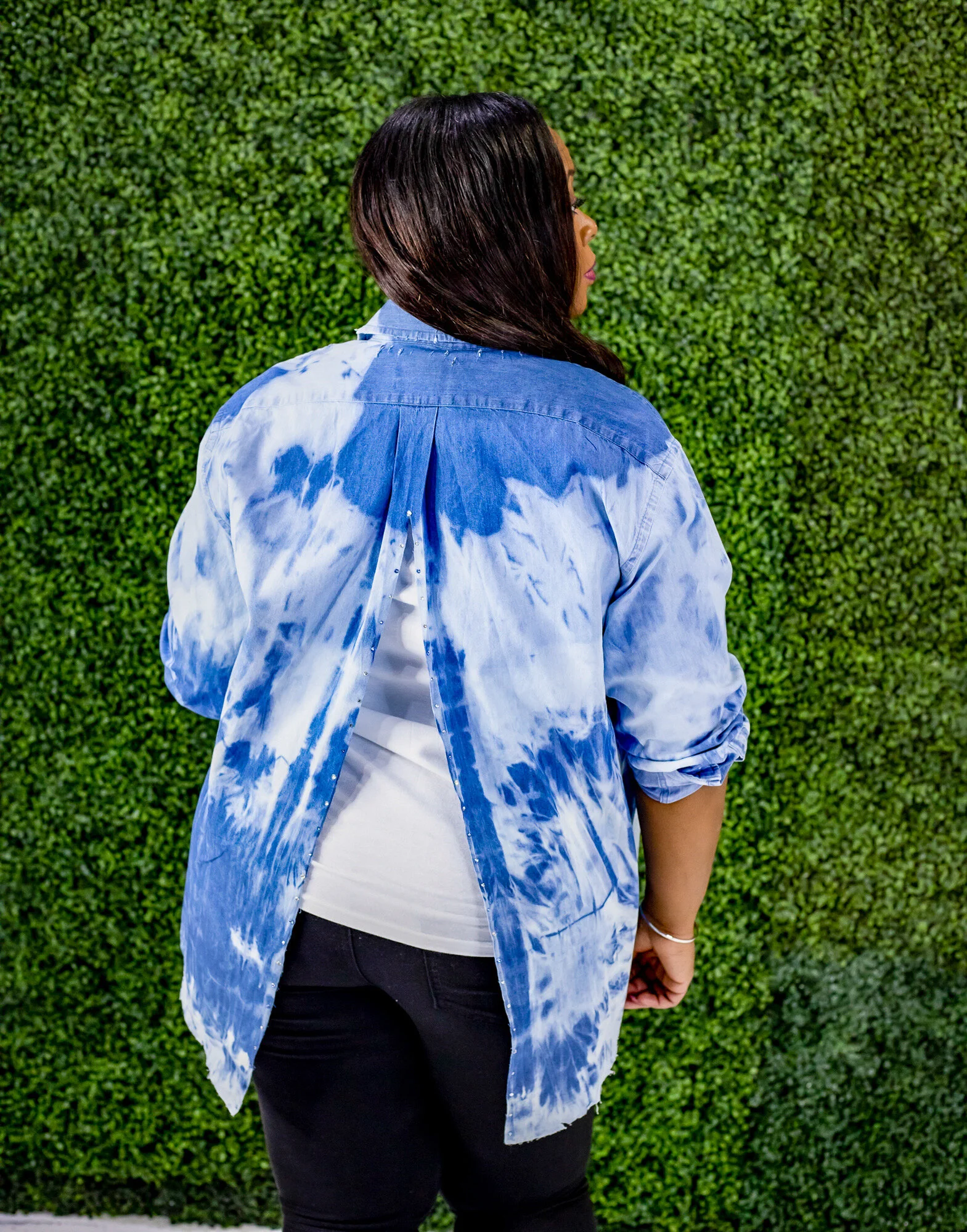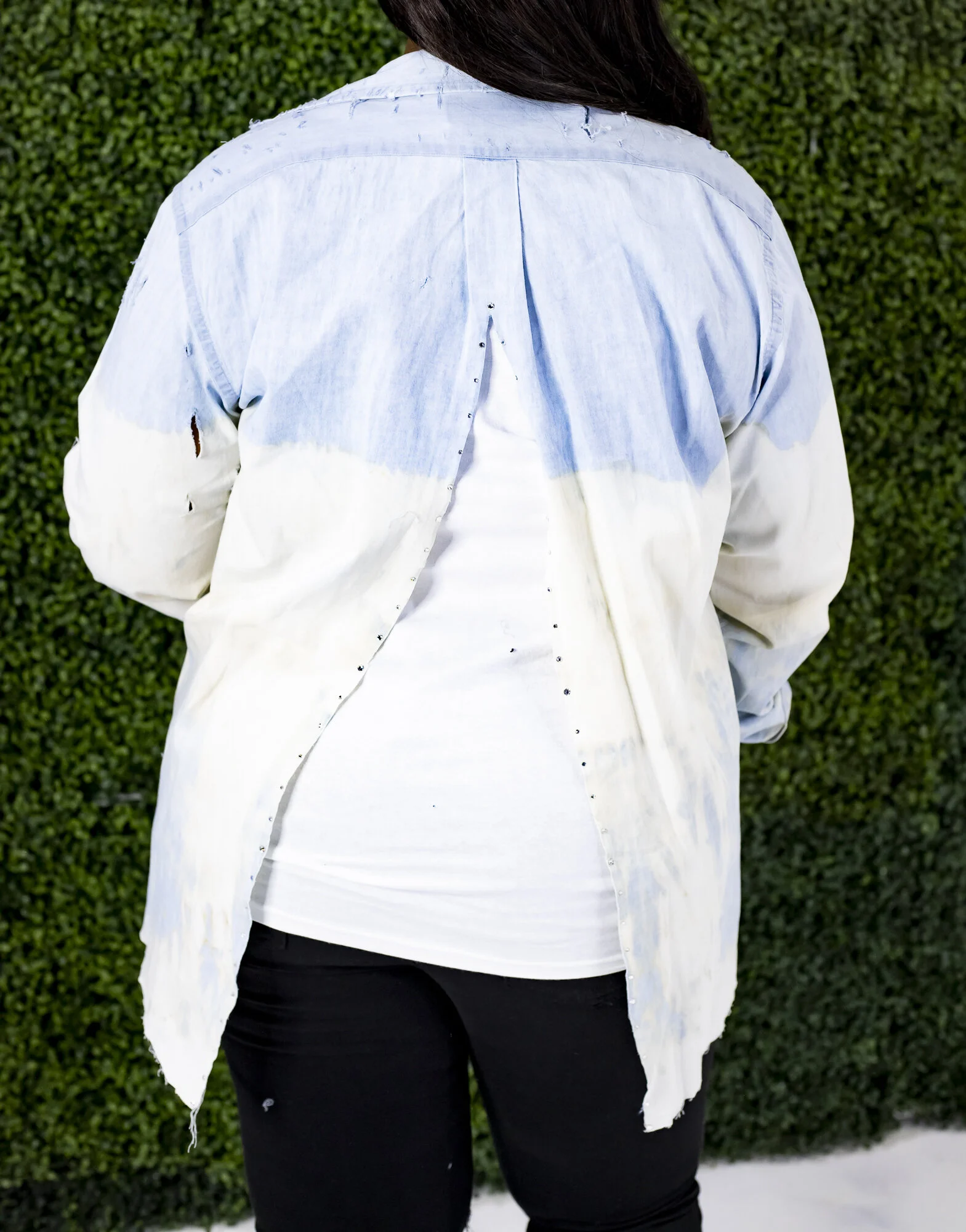 This shirt is color distressed. It has an open back split that is adorned with Swarovski Crystals.